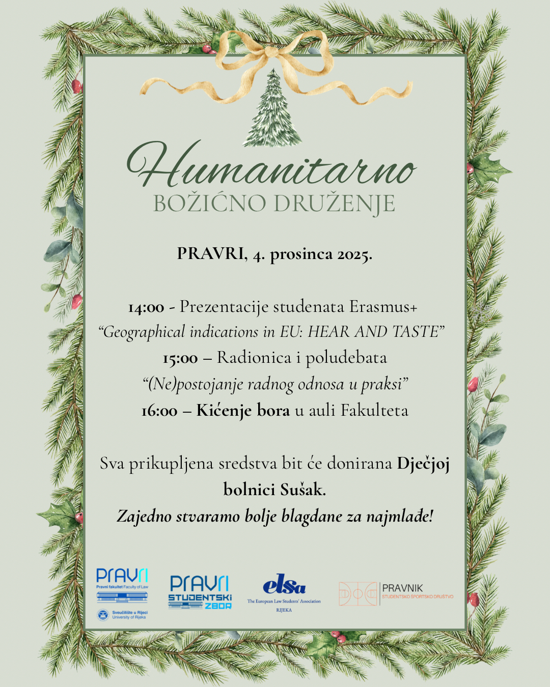 Pozivamo sve studentice i studente te nastavnice i nastavnike na Humanitarno božićno druženje, koje će se na Pravnom fakultetu u Rijeci održati 4. prosinca 2025. godine.