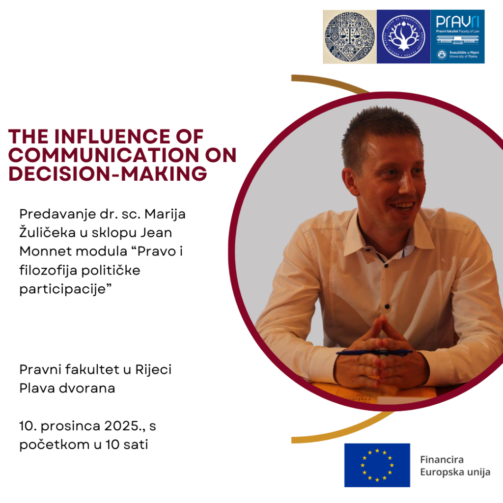 Pozivamo sve studentice i studente te druge zainteresirane pratitelje #pravri da nazoče gostujućem predavanju dr. sc. Marija Žuličeka (Centar za studije mira i konflikata Sveučilišta u Rijeci) na predavanje koje će održati studentima pete godine studija Pravo, u sklopu kolegija Retorika i govorništvo u pravu. Predavanje povezuje retoriku i procese odlučivanja, prikazujući, iz vizure komunikologije, kako adekvatno komuniciranje može utjecati na donošenje odluka. Zato je ovo ujedno aktivnost koja se neposredno dotiče sudjelovanja u procesima odlučivanja te se organizira uz potporu Jean Monnet modula “Pravo i filozofija političke participacije” te Zavoda za demokraciju, socijalnu pravdu i održivi razvoj.