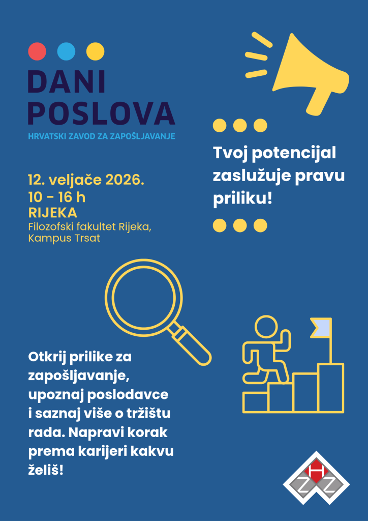 Hrvatski zavod za zapošljavanje vas poziva na Dane poslova koji će se održati 12. veljače 2026. od 10:00 do 16:00 sati na Filozofskome fakultetu u Rijeci.