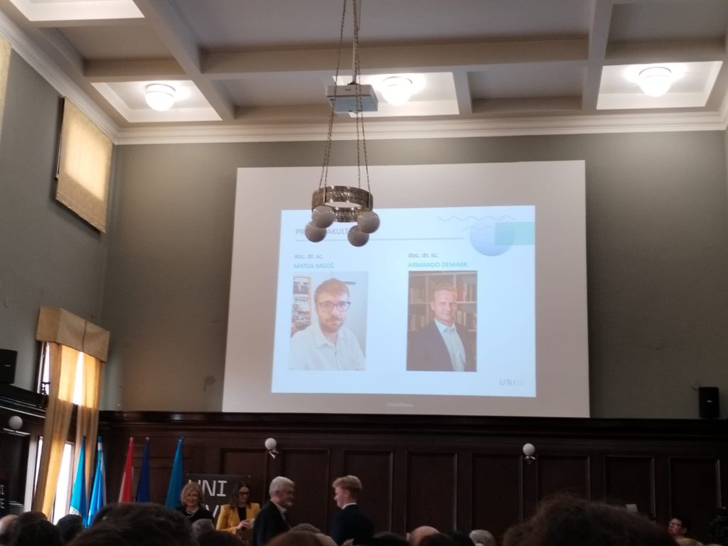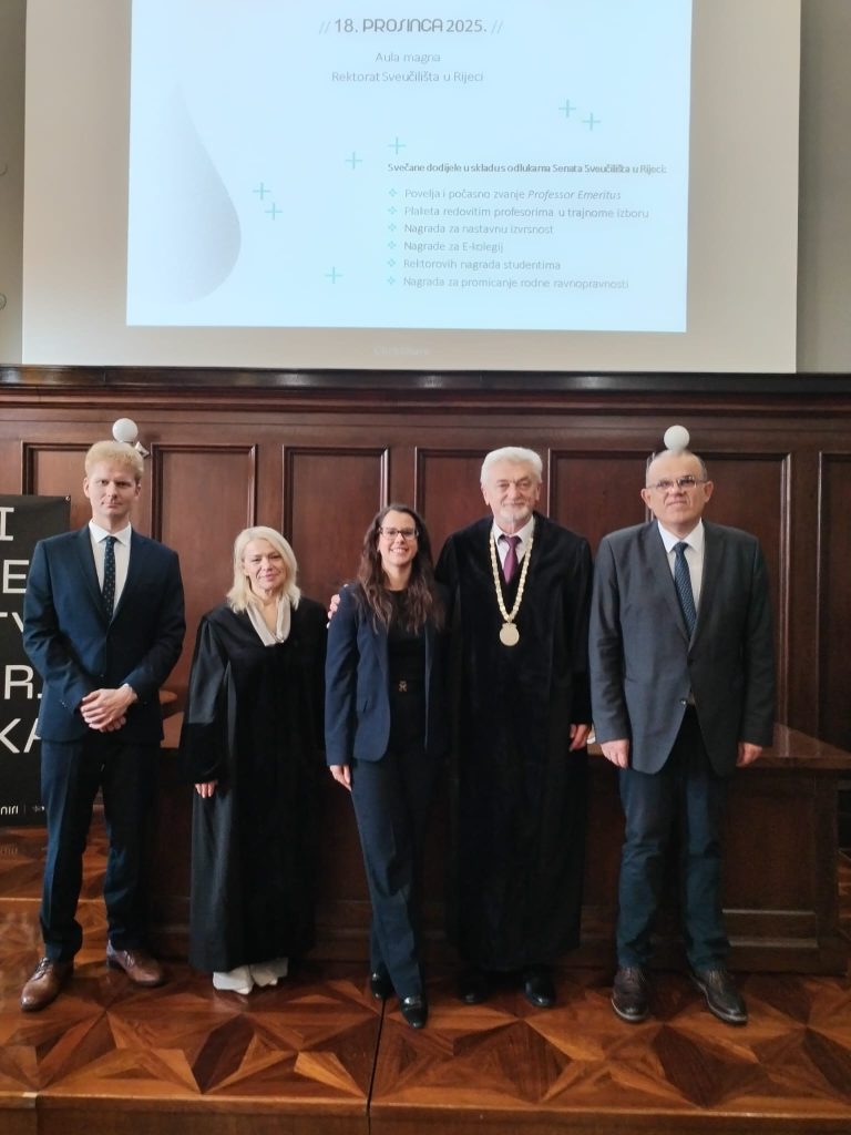 U sklopu tradicionalnog blagdanskog prijema održanog 18. prosinca 2025. na Rektoratu Sveučilišta u Rijeci, v. d. rektor Sveučilišta u Rijeci prof. dr. sc. Davor Vašiček dodijelio je akademska priznanja i nagrade, uključujući plaketu redovitom profesoru u trajnom izboru dr. sc. Budislavu Vukasu, nagrade za nastavnu izvrsnost docentu dr. sc. Matiji Milošu i docentu dr. sc. Armandu Demarku, dok je rektorovu nagradu studentima ponijela Maja Medved, a rektorovu nagradu za najboljeg doktoranda Martina Smojver u kategoriji društvene i humanističke znanosti.