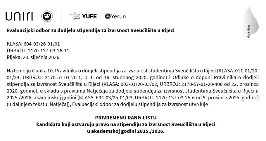 Objavljena Privremena rang-lista kandidata koji su ostvarili pravo na stipendiju za izvrsnost u 2025./2026. ak. god.