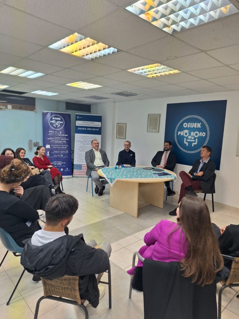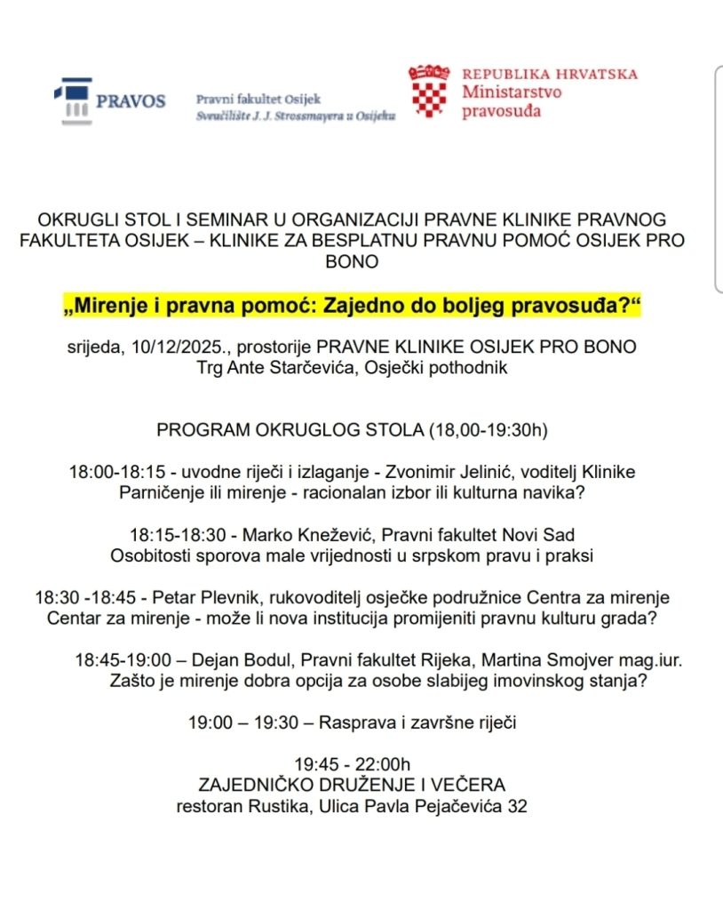 Dana 10. prosinca 2025. godine u Osijeku održan je okrugli stol „Mirenje i pravna pomoć: Zajedno do boljeg pravosuđa?“ u organizaciji Pravne klinike Pravnog fakulteta u Osijeku, uz suradnju Pravne klinike Pravnog fakulteta u Rijeci. Ovaj okrugli stol okupio je dionike iz sustava besplatne pravne pomoći i mirenja, kao i predstavnike Pravnog fakulteta u Novom Sadu koji su podijelili svoja iskustva i omogućili uvid u rješenja iz srpskog prava i prakse. Kao predstavnici Pravne klinike u Rijeci sudjelovali su izv. prof. dr. sc. Dejan Bodul, doc. dr. sc. Josip Dešić te asistentica Martina Smojver.