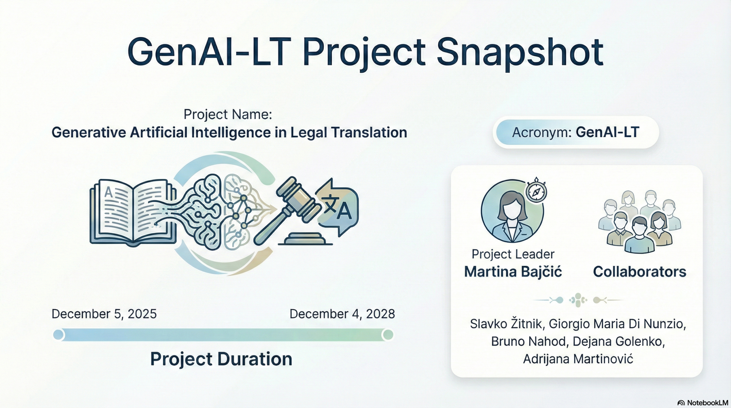 Utjecaj umjetne inteligencije na međujezičnu komunikaciju nedvojbeno je značajan. Neuronski modeli dramatično su poboljšali kvalitetu strojnoga prevođenja te se neprestano razvijaju nove tehnologije i alati generativne umjetne inteligencije, kao što su veliki jezični modeli. Unatoč rastućem interesu i znanstvenika i šire javnosti za primjenu ovih alata, njihova upotreba u području pravnoga prevođenja slabo je istražena. S obzirom na trend nezabilježenog interesa za primjenom umjetne inteligencije s jedne strane, važnost područja pravnoga prevođenja i razumijevanja pravne terminologije za sve građane, ali i za budućnost europskih integracija i jedinstvenog tržišta s druge strane, nužna su empirijska istraživanja o njihovoj primjeni na prevođenje prava. Projektom će se istražiti primjena generativne umjetne inteligencije u prevođenju pravnih tekstova objedinjavanjem suvremenih metoda i pristupa iz triju ključnih područja: automatiziranog pravnog prevođenja, korpusno-utemeljene terminologije i (pravnih) informacijskih znanosti (obrada prirodnog jezika; pravna informacija). Primijenit će se tehnike i metode obrade prirodnog jezika kako bi se integriralo znanje iz domene prava s jezičnim modelima te će se istražiti moguća unaprjeđenja modela u pogledu na terminologiju. Navedene metode i pristupi prilagodit će se obilježjima područja prava EU-a.