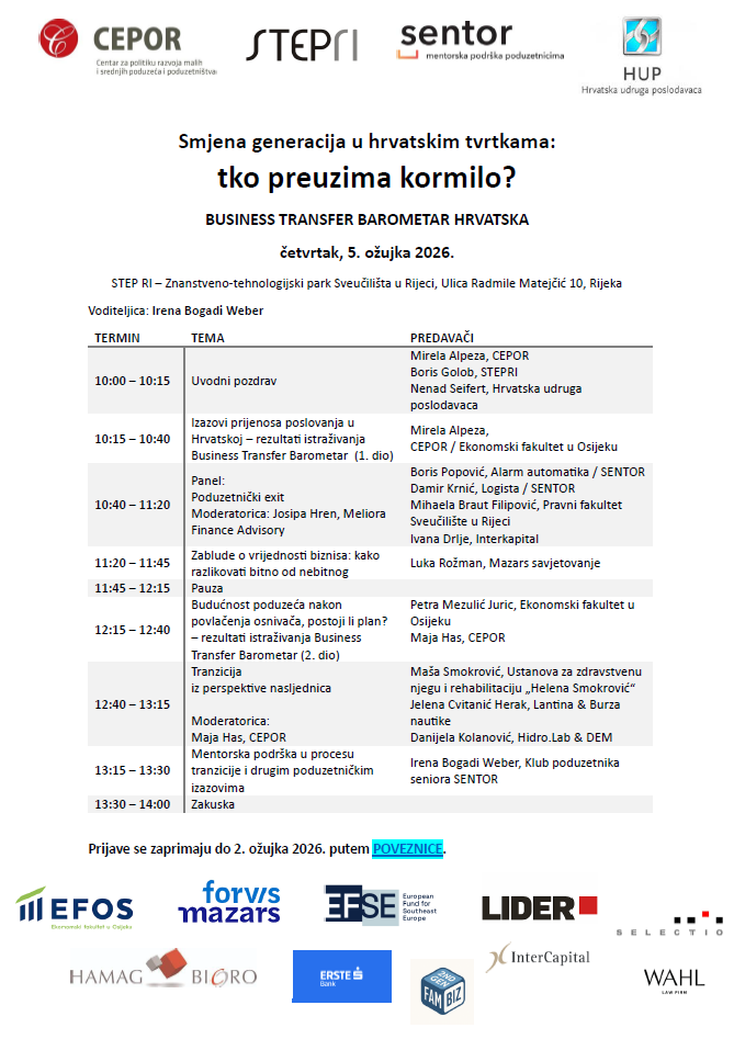 Voditeljica istraživačkog projekta 2ND-GEN-FAM-BIZ Croatia, izv. prof. dr. sc. Mihaela Braut Filipović, sudjelovala je na panel raspravi „Poduzetnički exit“, održanoj u okviru skupa „Smjena generacija u hrvatskim tvrtkama: tko preuzima kormilo?“ u Rijeci, 5. ožujka 2026. godine. Skup je održan u STEP RI – Znanstveno-tehnologijskom parku Sveučilišta u Rijeci, u organizaciji CEPOR-a.