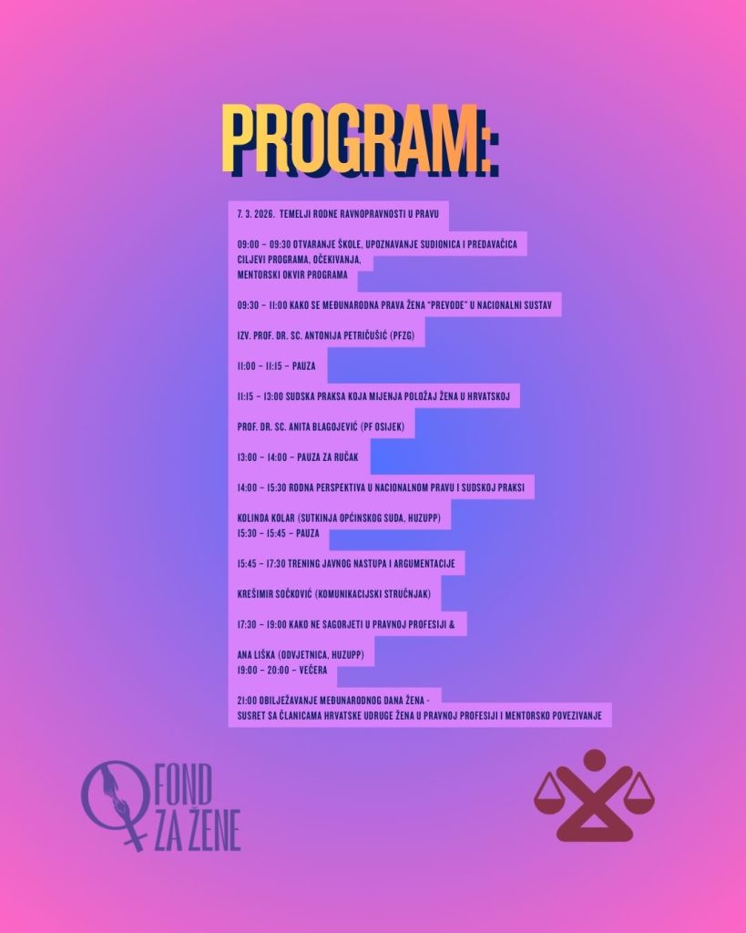 Povodom obilježavanja Međunarodnog dana žena, Hrvatska udruga žena u pravnoj profesiji (HUZUPP) organizira Školu rodne ravnopravnosti, dvodnevni edukativni program koji će se održati 7. i 8. ožujka 2026. godine u Hotelu Novi Zagreb (Ulica Ive Robića 2).