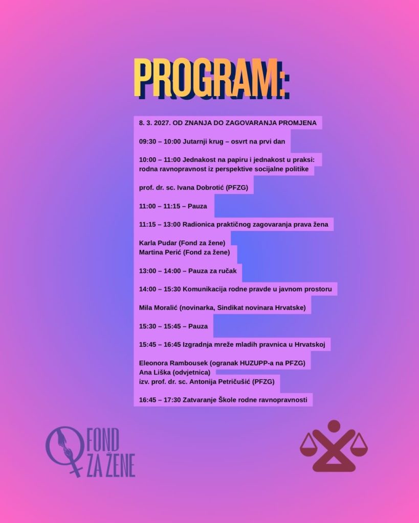 Program je namijenjen studenticama i studentima pravnih fakulteta iz cijele Hrvatske, a odabrano će biti 30 sudionica i sudionika koji će kroz predavanja, mentorski rad i praktične radionice unaprijediti svoja znanja i vještine u području rodne ravnopravnosti i prava žena.